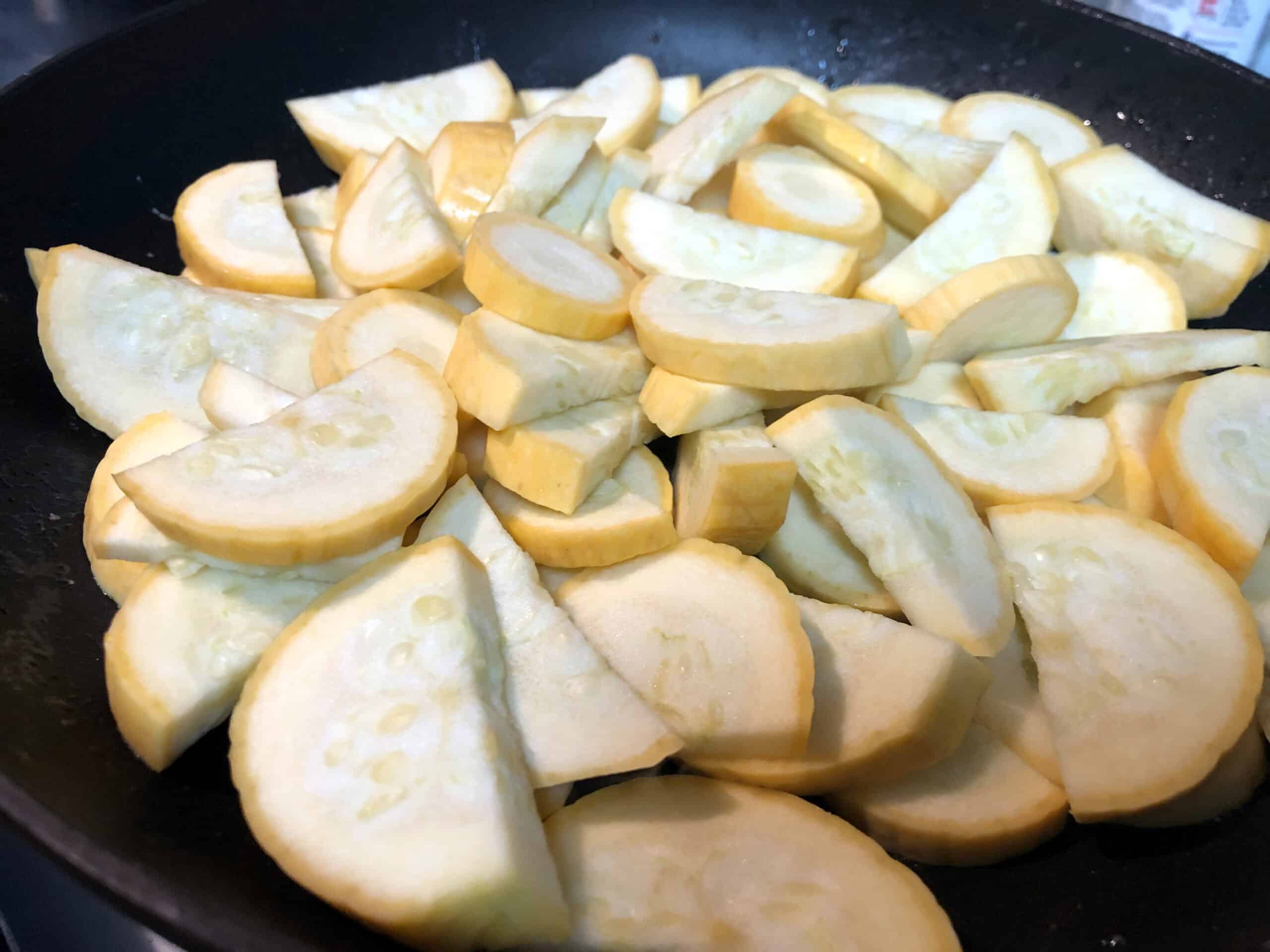 Yellow squash adds color, freshness, and a mild sweetness to the dish. For even cooking, the squash is sliced into rounds and then halved, creating bite-sized pieces that cook quickly while still holding their shape. This keeps the squash tender without becoming mushy.