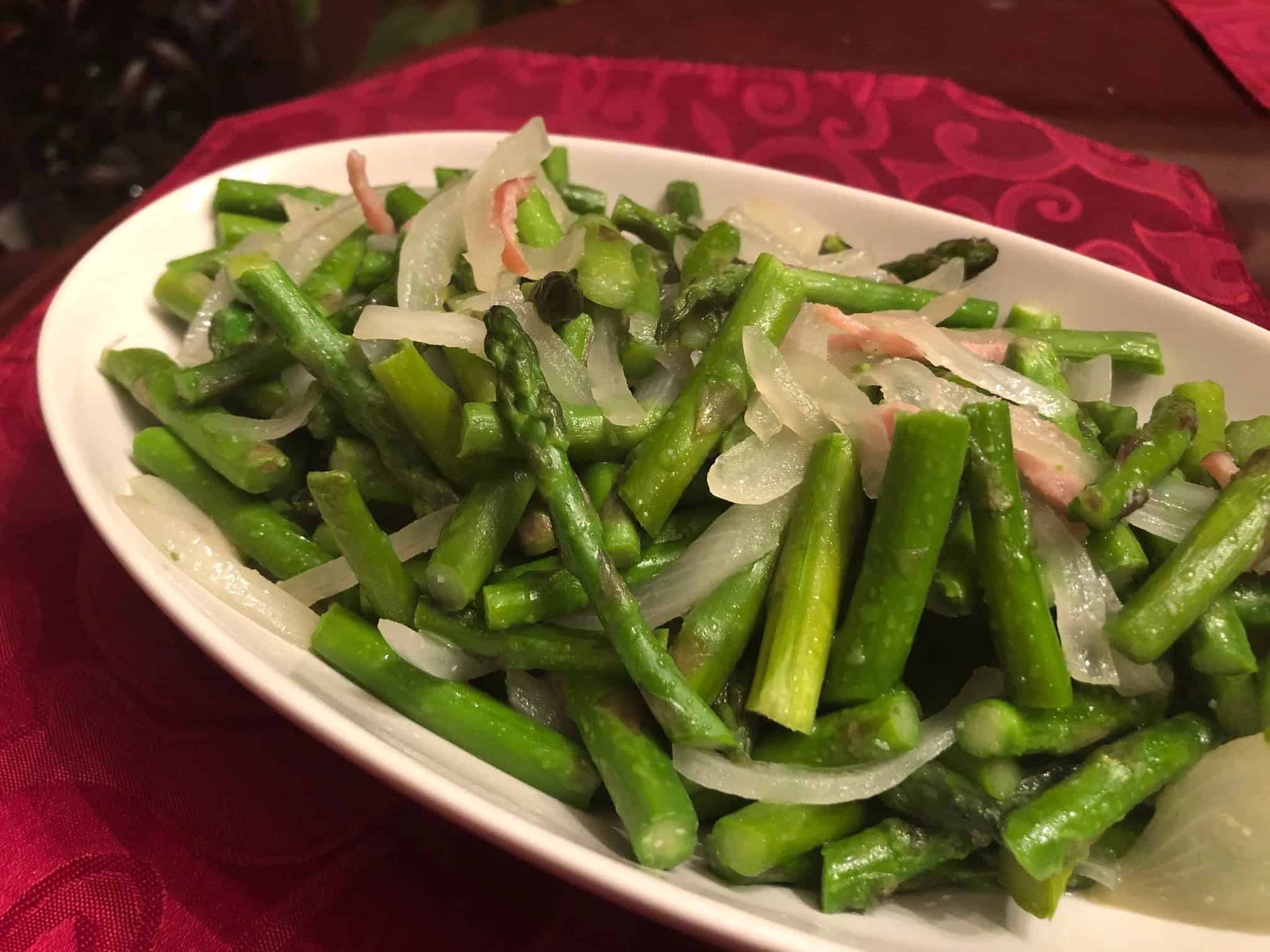 - Tender-crisp asparagus with savory ham and lightly sweet onions