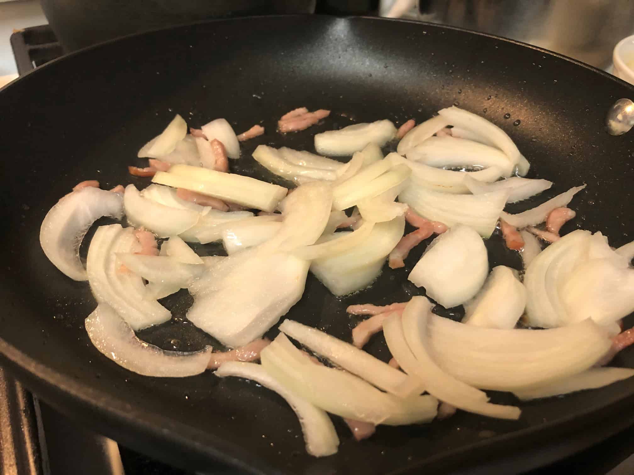 Heat the cooking oil in a medium skillet or wok over high heat. Once the oil is hot, add the sliced ham and onions. Stir fry for about 1 minute, just until the onions begin to soften and the ham becomes fragrant.
