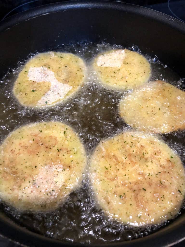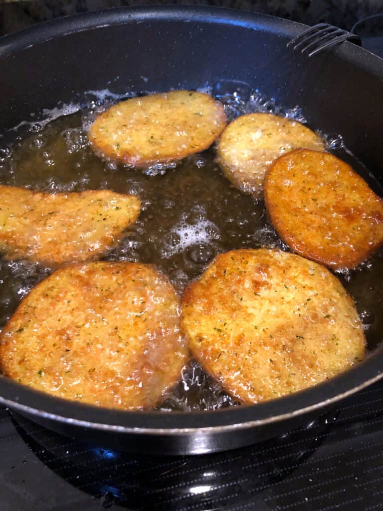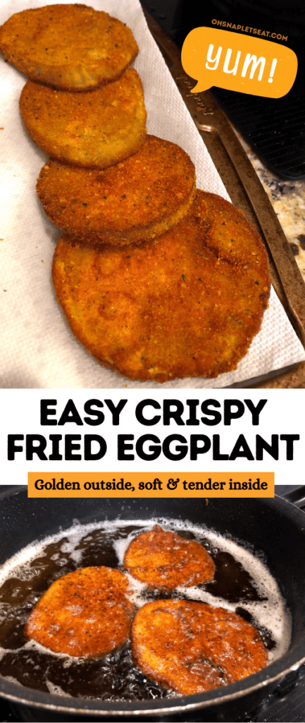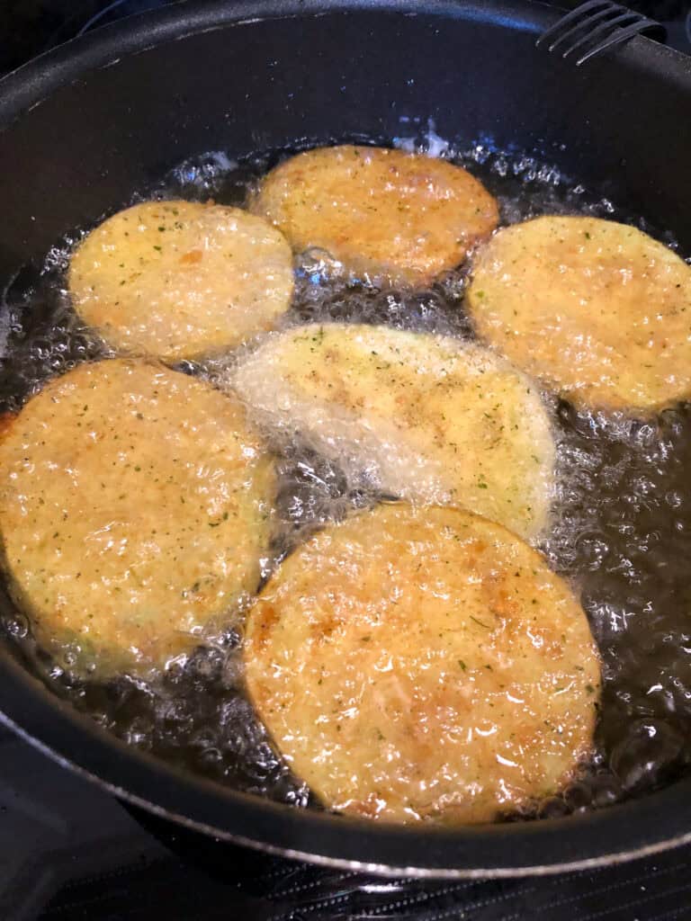 In a deep, heavy skillet, add about 1 inch of oil, and heat to about 375 degrees. Add eggplants to the pan in batches. Cook about 1-2 minutes per side, or until the eggplants turn golden brown. Remove from heat and place on paper towel baking dish.
