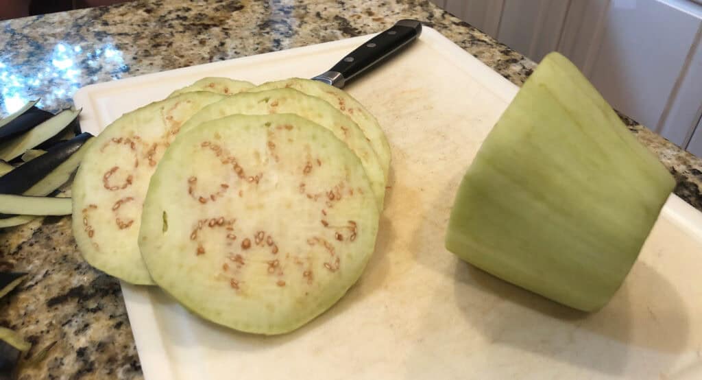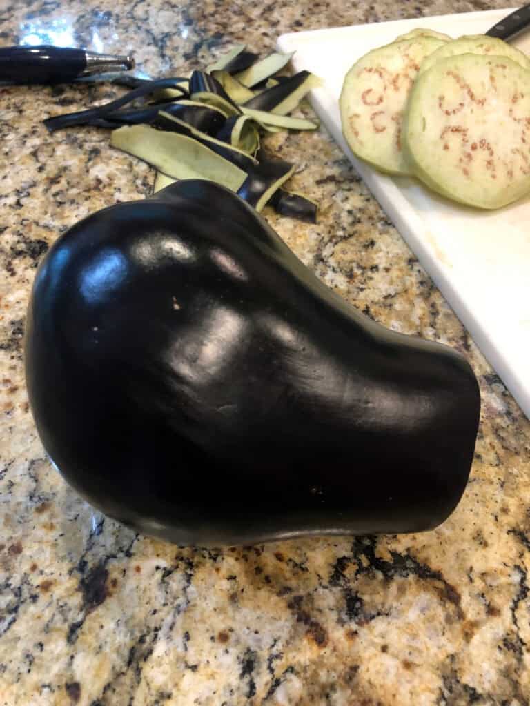 - Peel the eggplant if desired, then slice into ¼-inch thick rounds.