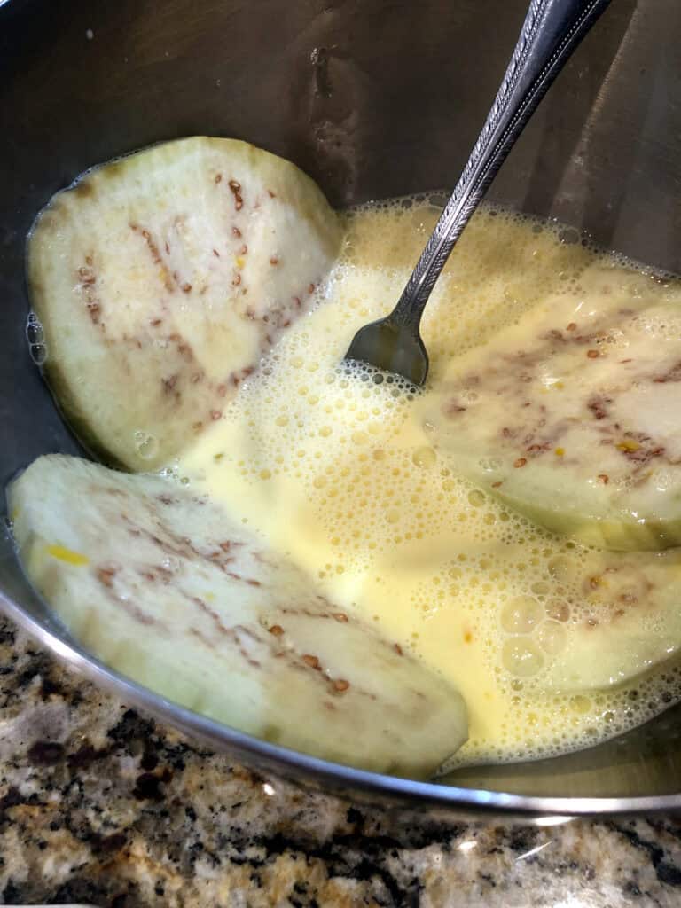 - Dip each slice of eggplant into the egg mixture, then coat in the breadcrumb mixture. Set aside on a plate.