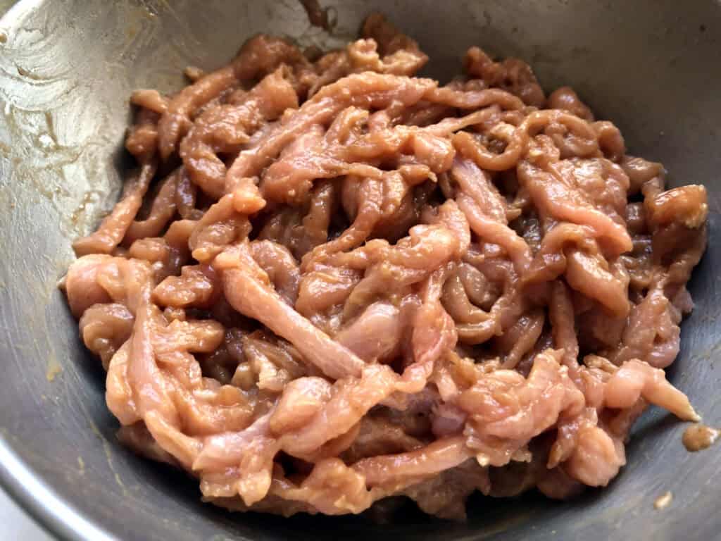 In a large bowl, add all the marinade ingredients (oil, cornstarch, soy sauce) with pork and mix well. Let sit for at least 15 minutes.