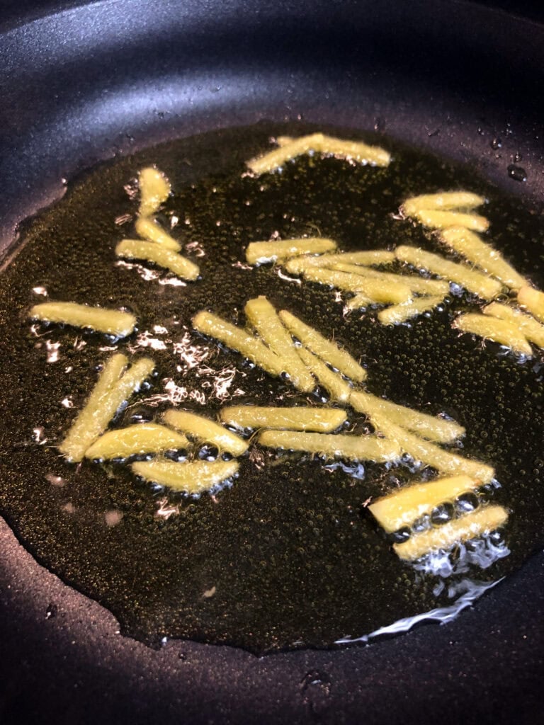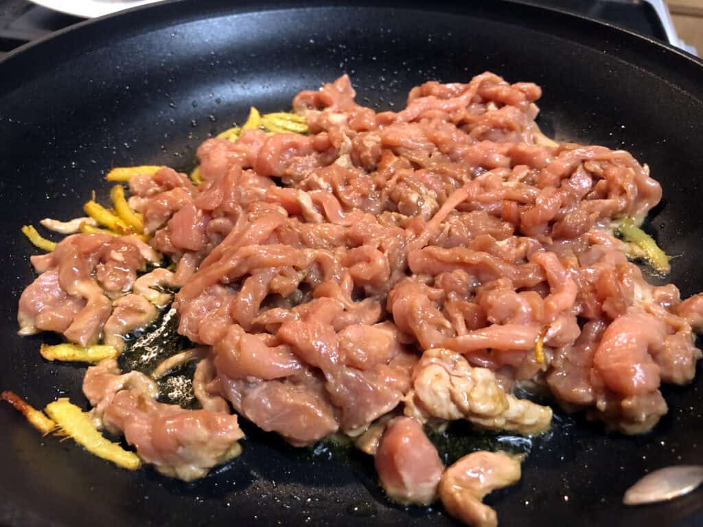 - Stir fry pork: Heat oil in a wok or pan over medium-high heat. Add ginger and stir until fragrant (30 seconds). Add pork, stir fry 2 minutes until just browned. Remove pork + ginger from pan, leaving oil behind.