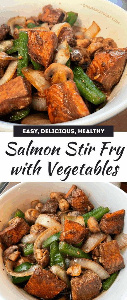This Salmon Stir Fry with Veggies is a quick and flavorful dinner idea! Cubed salmon is marinated in a honey soy garlic sauce, then stir-fried with onions, peppers, and mushrooms. Serve it with rice so it can soak up all that delicious sauce!