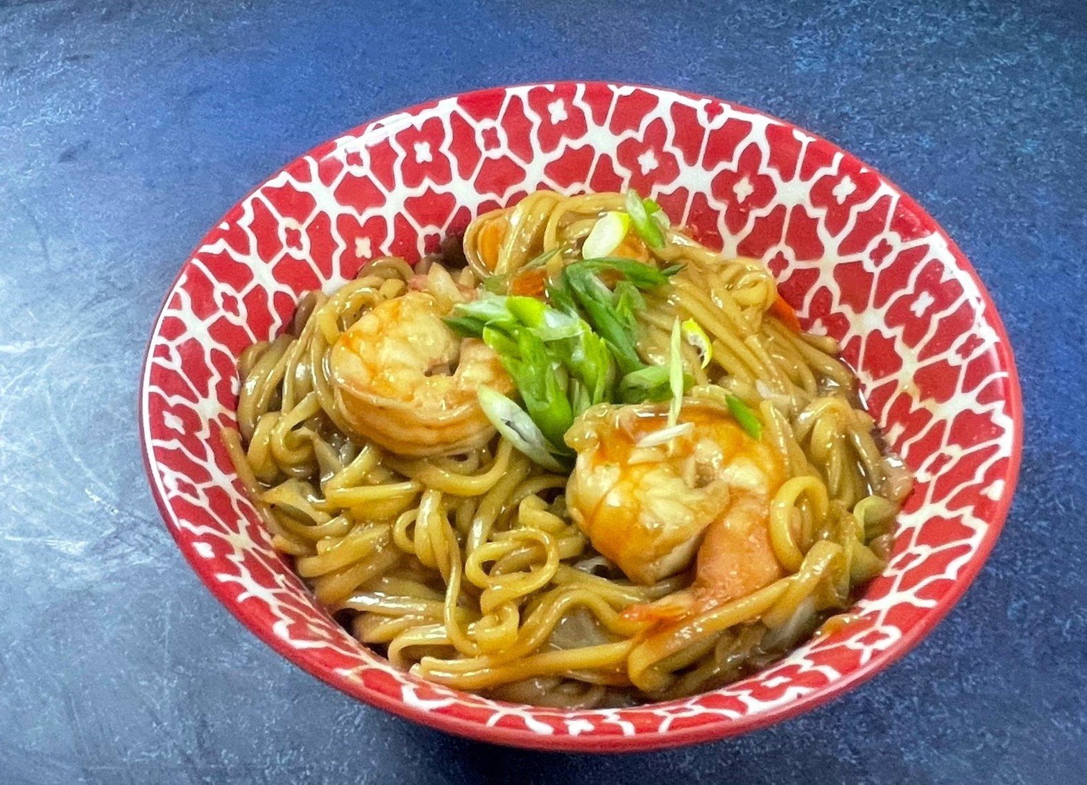 Succulent shrimp laced in a chili paste enhanced sauce with just a drizzle of this and a splash of that of some Asian staples. Add in whatever veggies you can think of, stir and fry for a few minutes and it’s ready to go over a bowlful of white rice.
