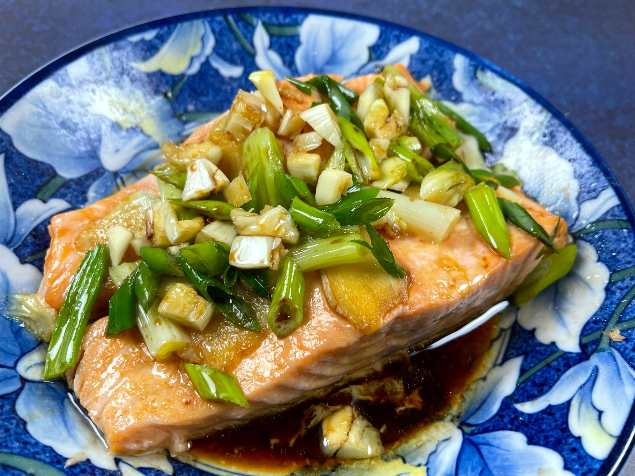 - Remove salmon from microwave, and then sprinkle the green onions, and garlic on top of the salmon. When the oil is hot, slowly pour it on top of all the green onions, ginger, garlic on top of the salmon (sizzle!)