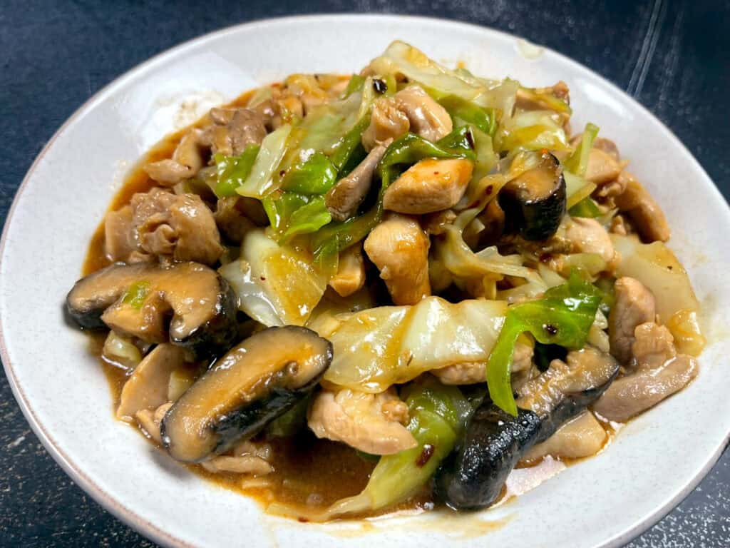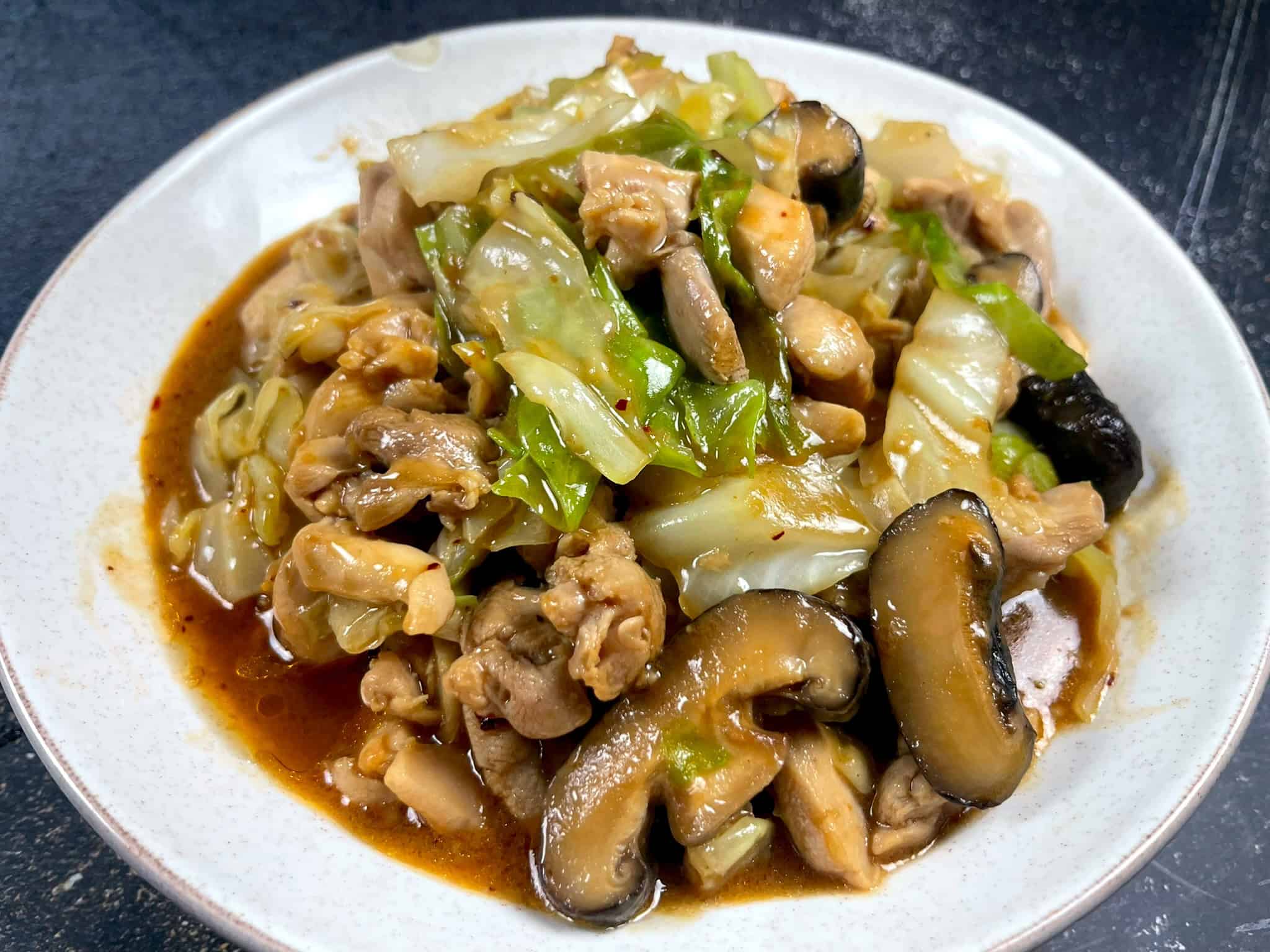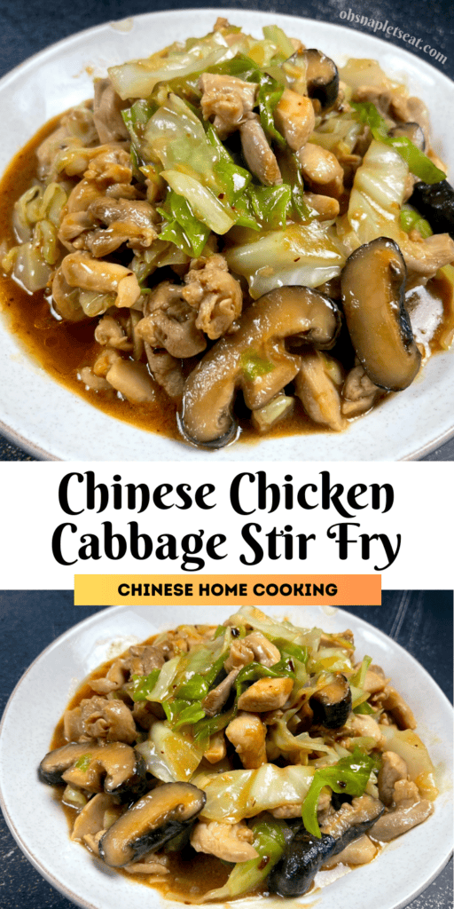 This Chicken Cabbage Stir Fry is a flavorful and comforting dish made with marinated chicken thighs, garlic, ginger, shiitake mushrooms, and cabbage. It comes together in 30 minutes and is perfect for a quick, satisfying meal!