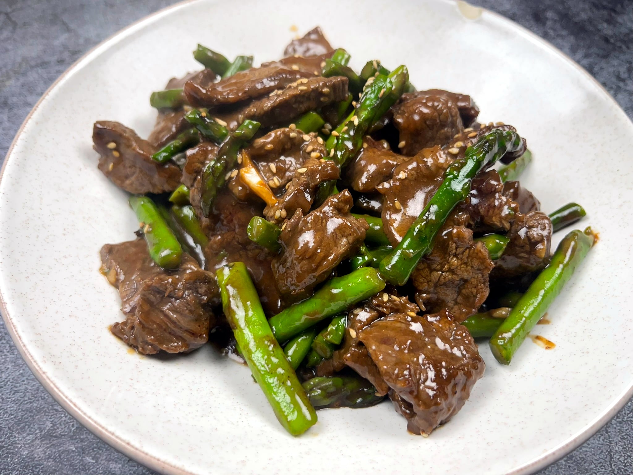 Juicy marinated beef stir fried with crisp asparagus, garlic, and savory oyster sauce. A quick and flavorful dish perfect for weeknights.