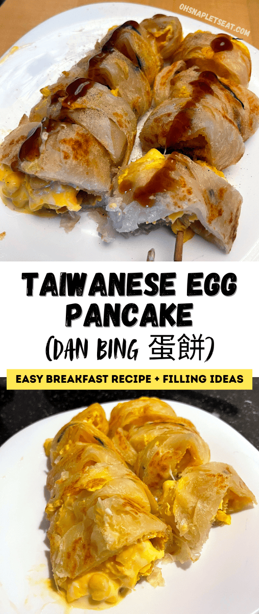 Dan bing (aka Egg Pancake) is a classic Taiwanese breakfast made with a thin crepe layered with egg and rolled up with tasty fillings. Traditionally, the crepe is soft and a little chewy-pan-fried until lightly crisp on the edges.
