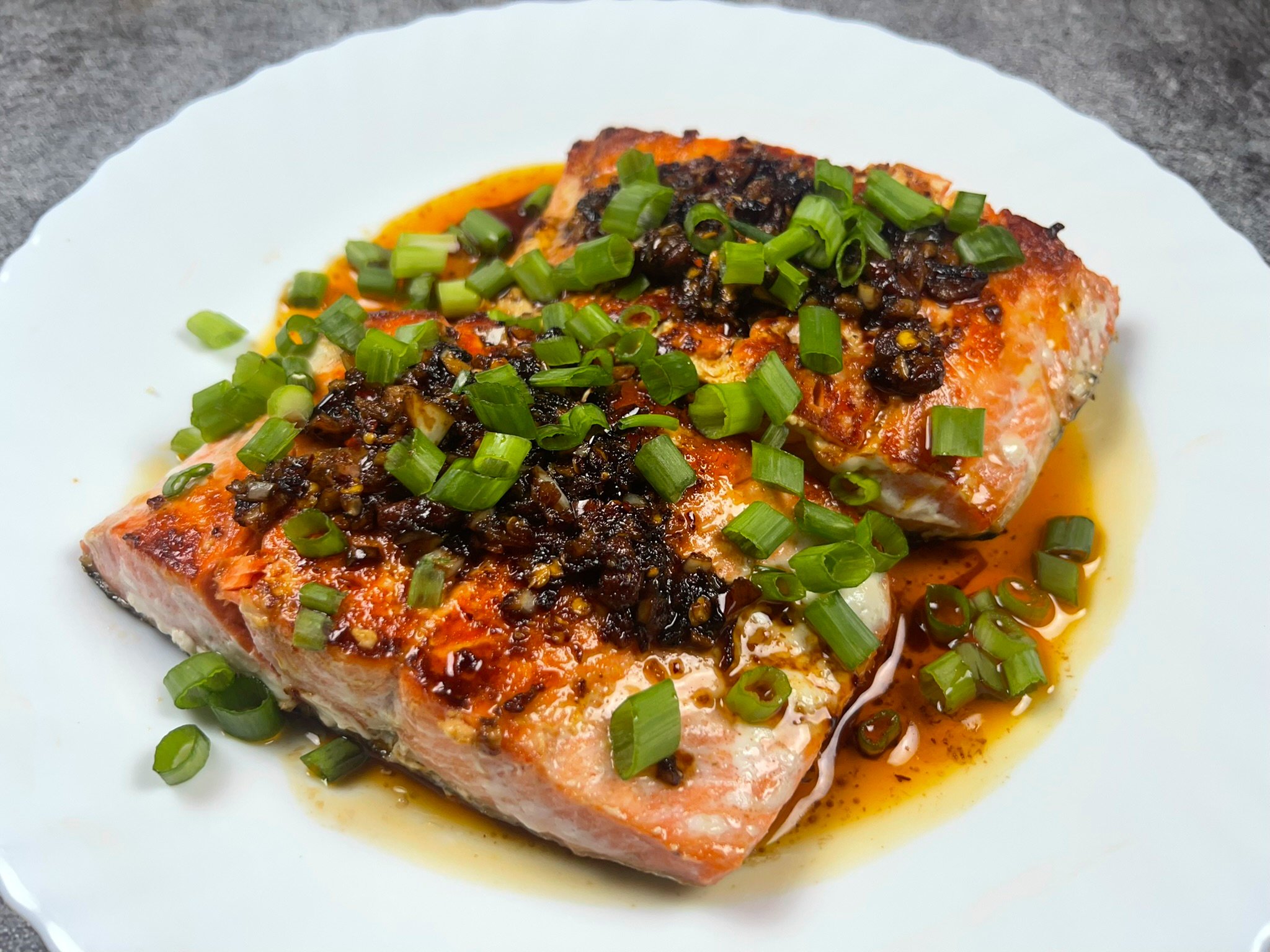 Plate the salmon and spoon the chili oil mixture over the top. Garnish with chopped scallions or sesame seeds if desired.