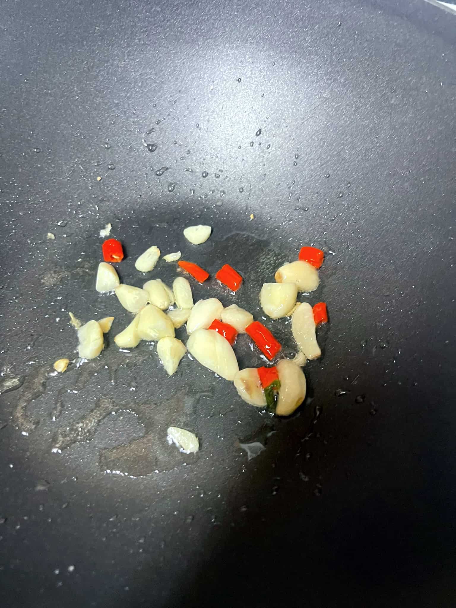 - Cook the Aromatics: Heat oil in a wok or skillet over medium-high heat. Add garlic (and chili pepper if using) and stir fry until fragrant, about 30 seconds.