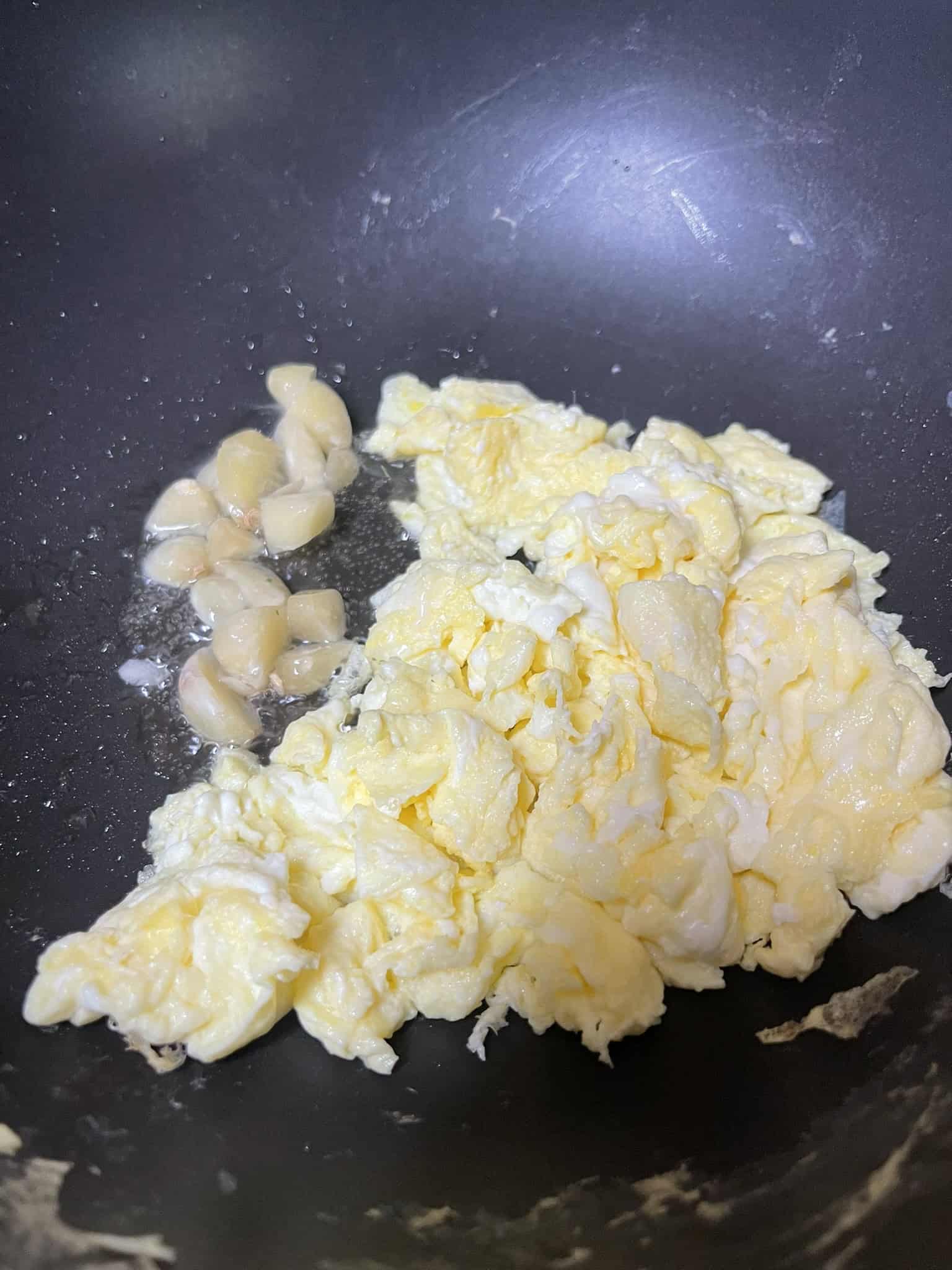 - Scramble the eggs – In the same pan, add more oil if needed. Pour in the beaten eggs and scramble. (Shortcut: crack the eggs straight into the pan and scramble lightly.) Push to the side or remove from the pan.