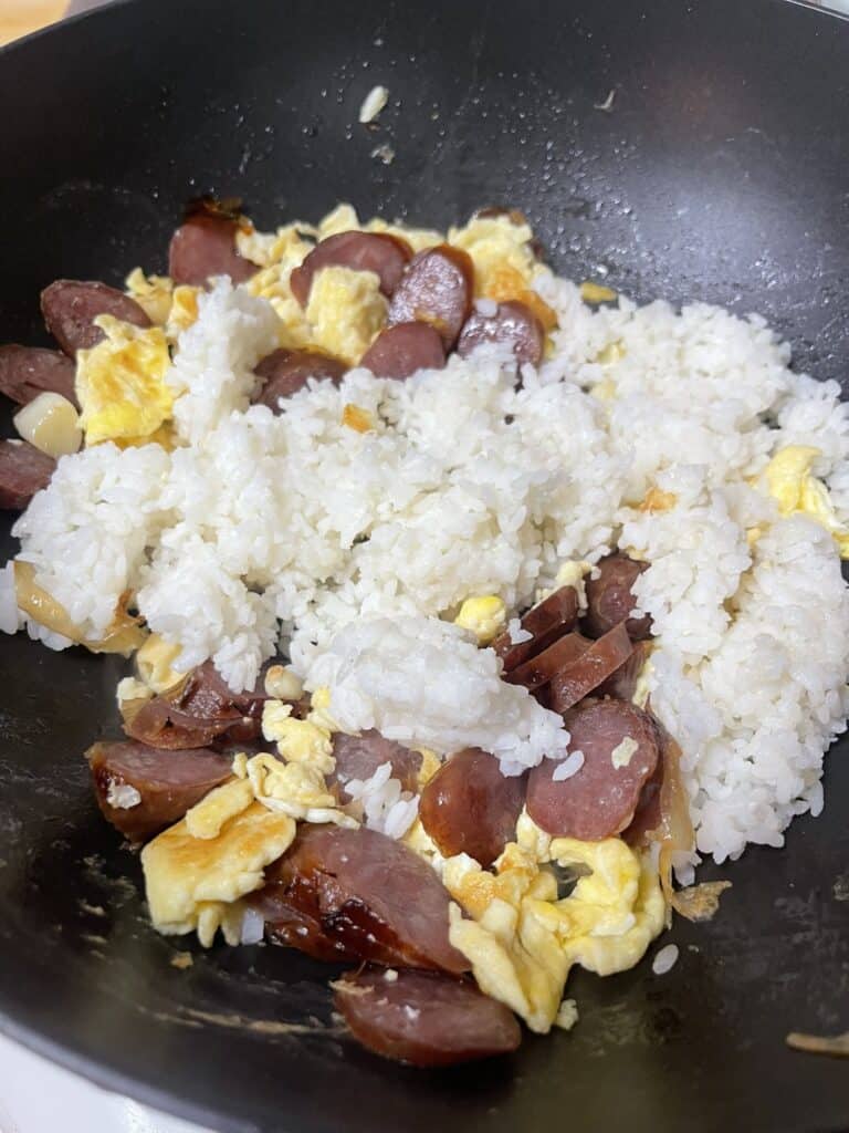 - Combine – Return the sausage (and eggs, if set aside) to the pan. Add the rice wine and stir. Then add the cooked rice, and break up any clumps with your spatula and stir-fry until evenly mixed.