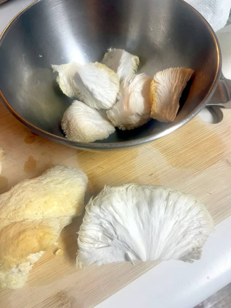 Cooking Tip: Tear, don't cut... I always tear Lion's Mane by hand instead of slicing it. Tearing helps keep that natural, fibrous texture intact and gives you uneven edges that brown up nicely in the pan. Plus, it keeps the mushrooms from getting soggy or dense.
