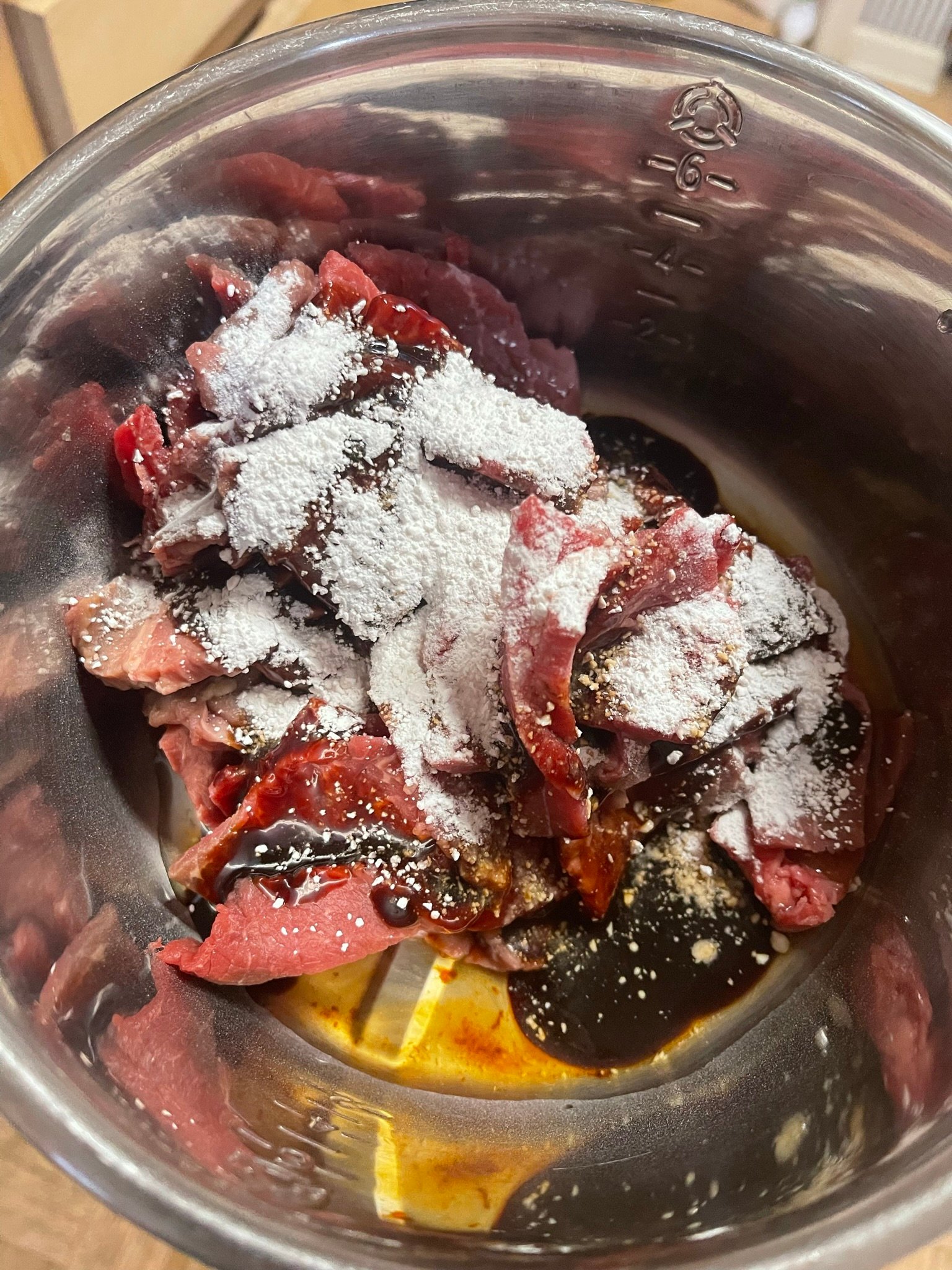 - Add soy sauce, Shaoxing wine (or rice wine), cornstarch, sesame oil, minced garlic, and sugar.