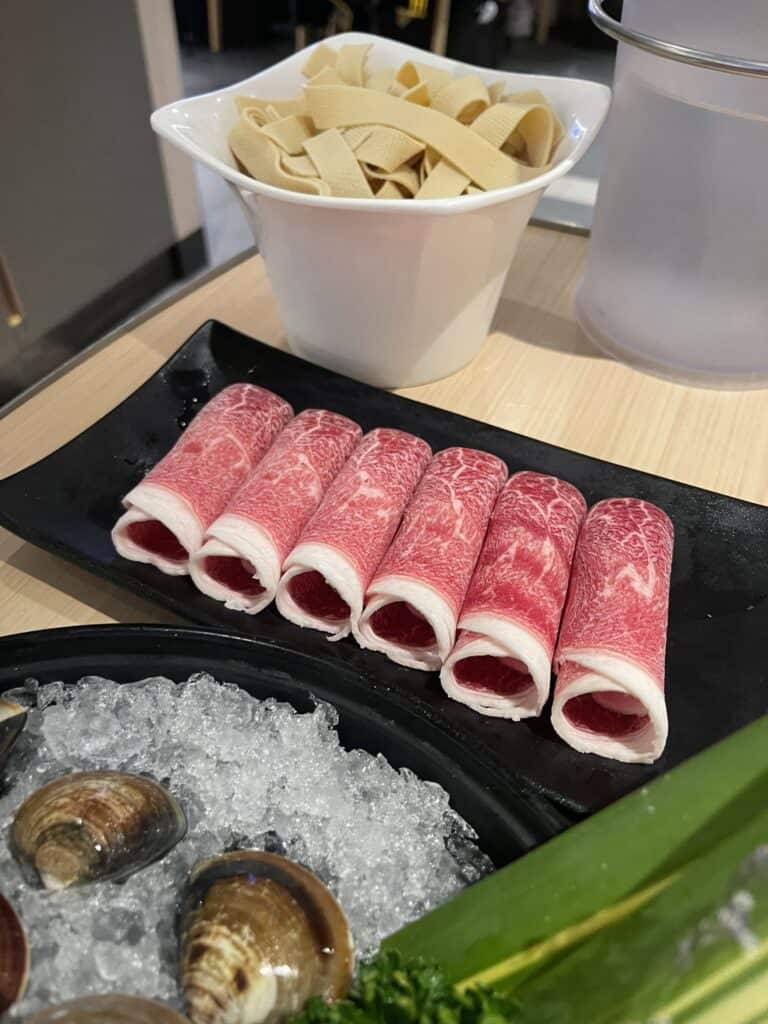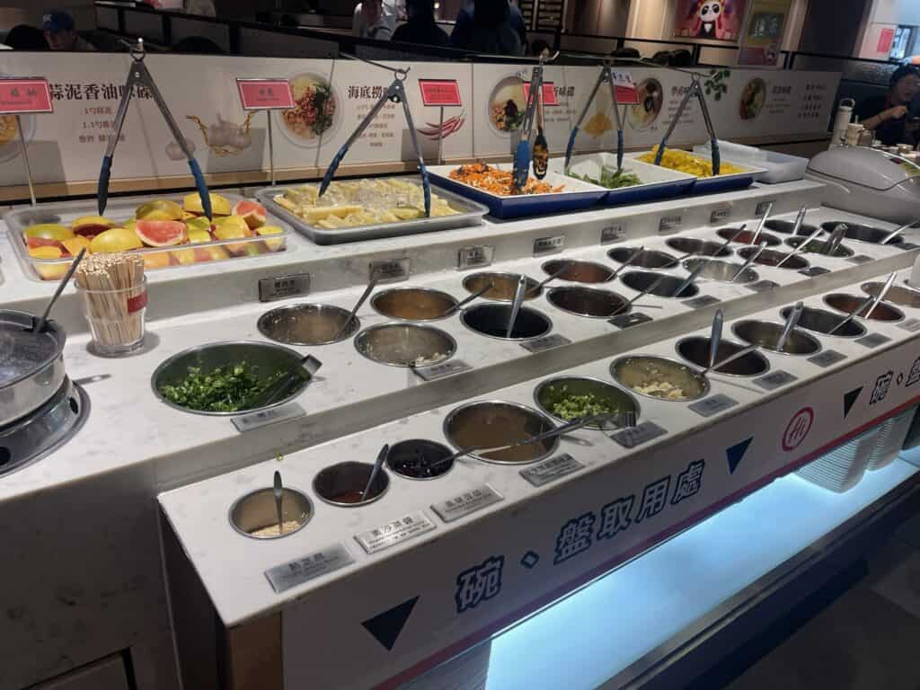 One thing to note: the DIY sauce bar and snack station are an extra fee, but it comes with way more than sauces. Along with all the dipping ingredients (sesame sauce, garlic, scallions, chilies, herbs, etc.), there are also little extras like papaya salad, edamame, fruit, and snacks. Honestly though, the broth flavors are so bold and intense that you don't even really need dipping sauce to enjoy your meal.