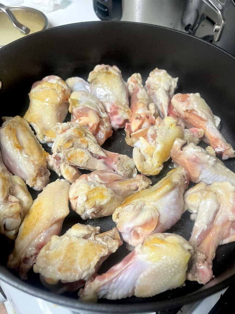 - Brown the wings - Heat a wide pan or wok over medium-high heat and add the oil. Add the chicken wings in a single layer and sear until lightly golden on all sides.