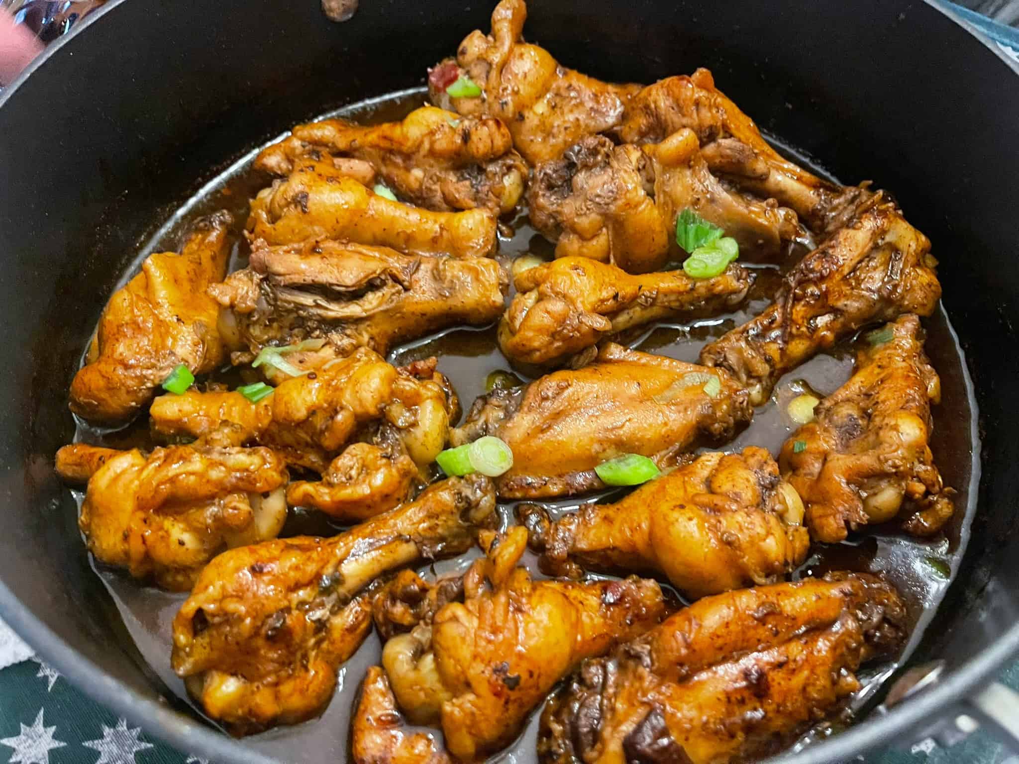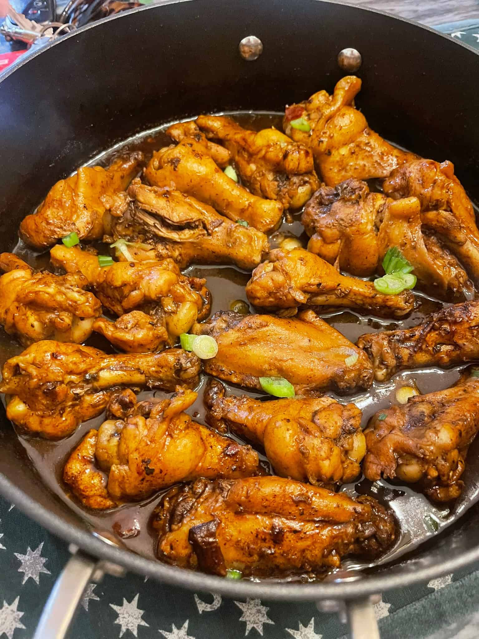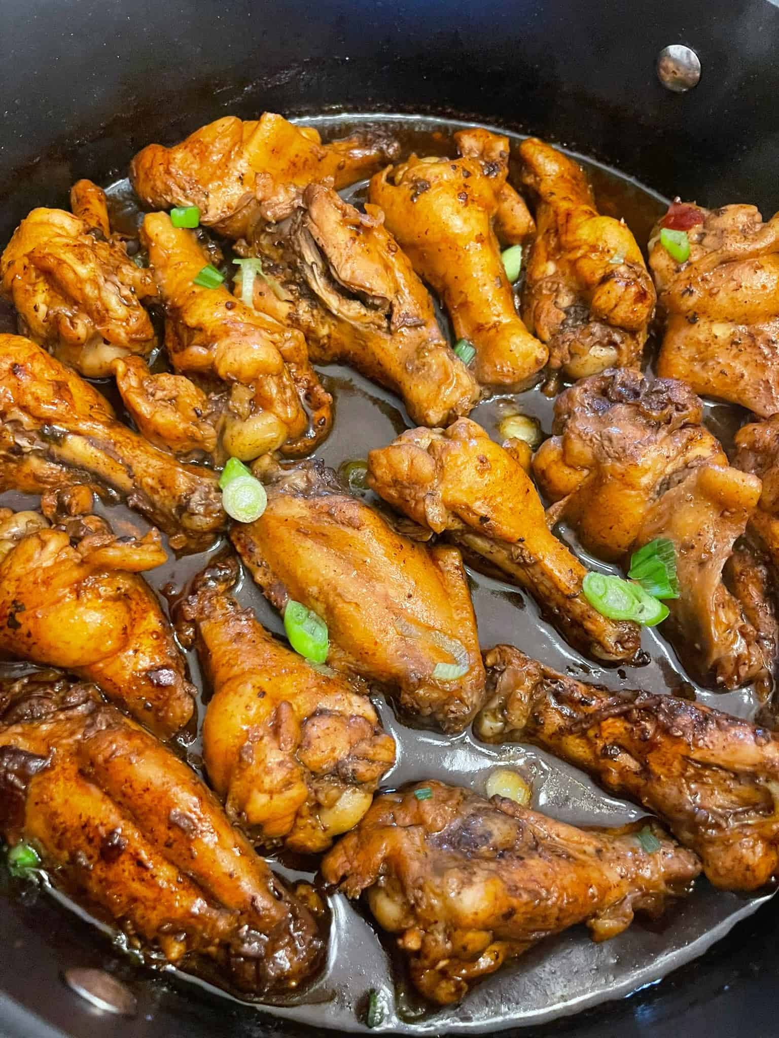 Uncover the pan and increase the heat to medium or medium-high. Let the sauce reduce, turning the wings frequently, until it thickens into a glossy, sticky glaze that coats the wings. Garnish with sliced green onions if desired.