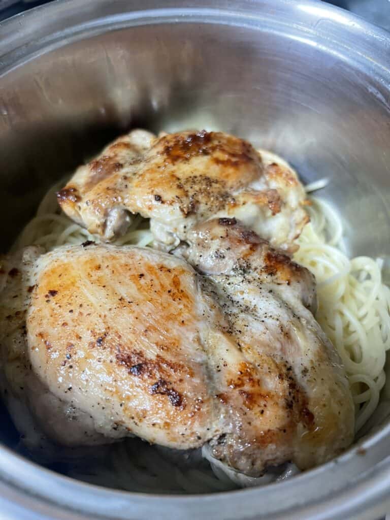 You can cook the chicken and sauce ahead of time and store them in the fridge. For best results, cook the pasta fresh and toss it with the sauce just before serving.
