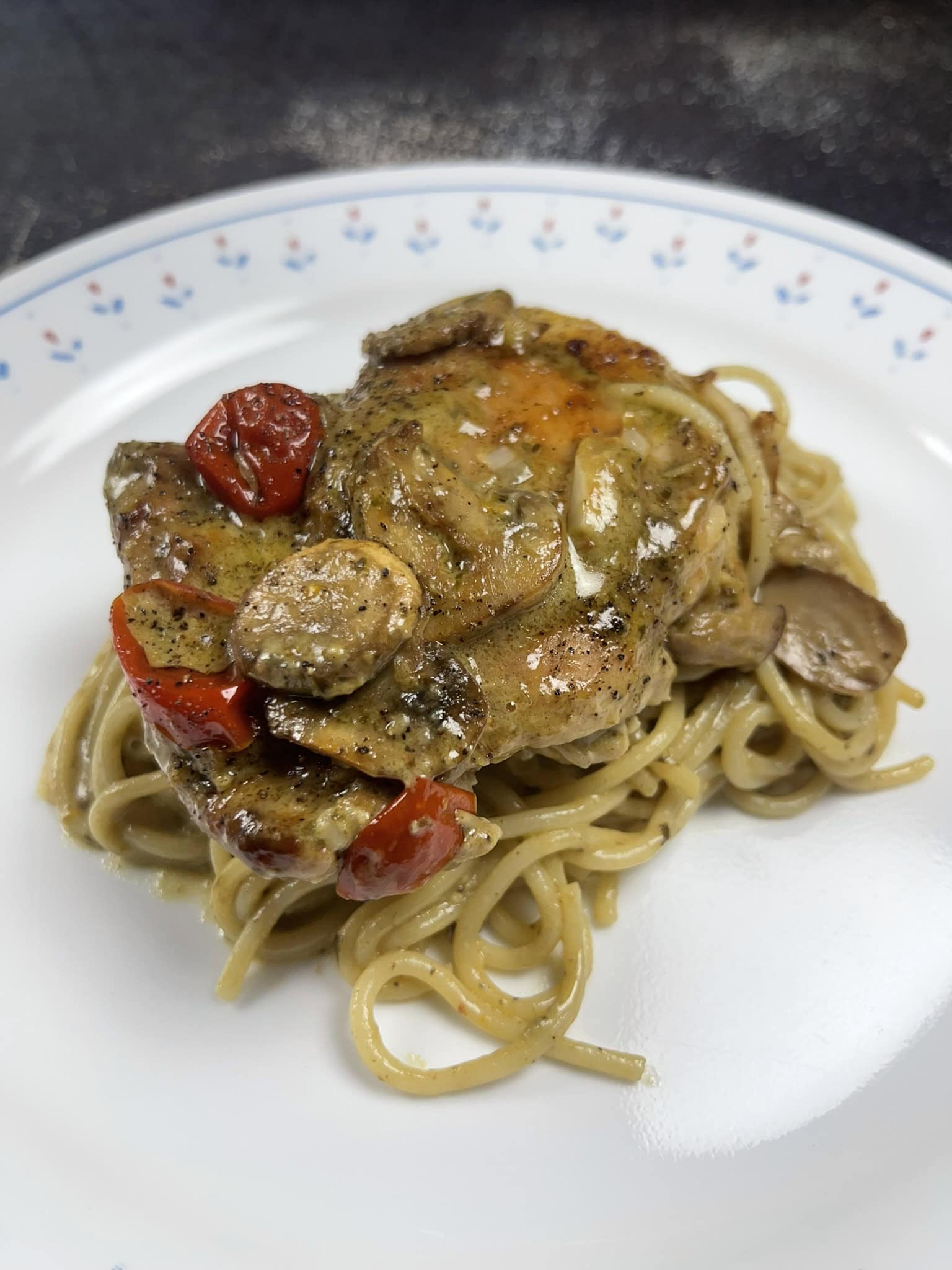 This creamy pesto chicken is an easy, cozy weeknight dinner made with chicken thighs or breasts simmered in pesto, mushrooms, and cherry tomatoes. The sauce is lightly creamy using milk instead of heavy cream, then tossed with thin spaghetti and finished with the chicken and vegetables spooned over the top. Simple, comforting, and full of flavor without feeling heavy.