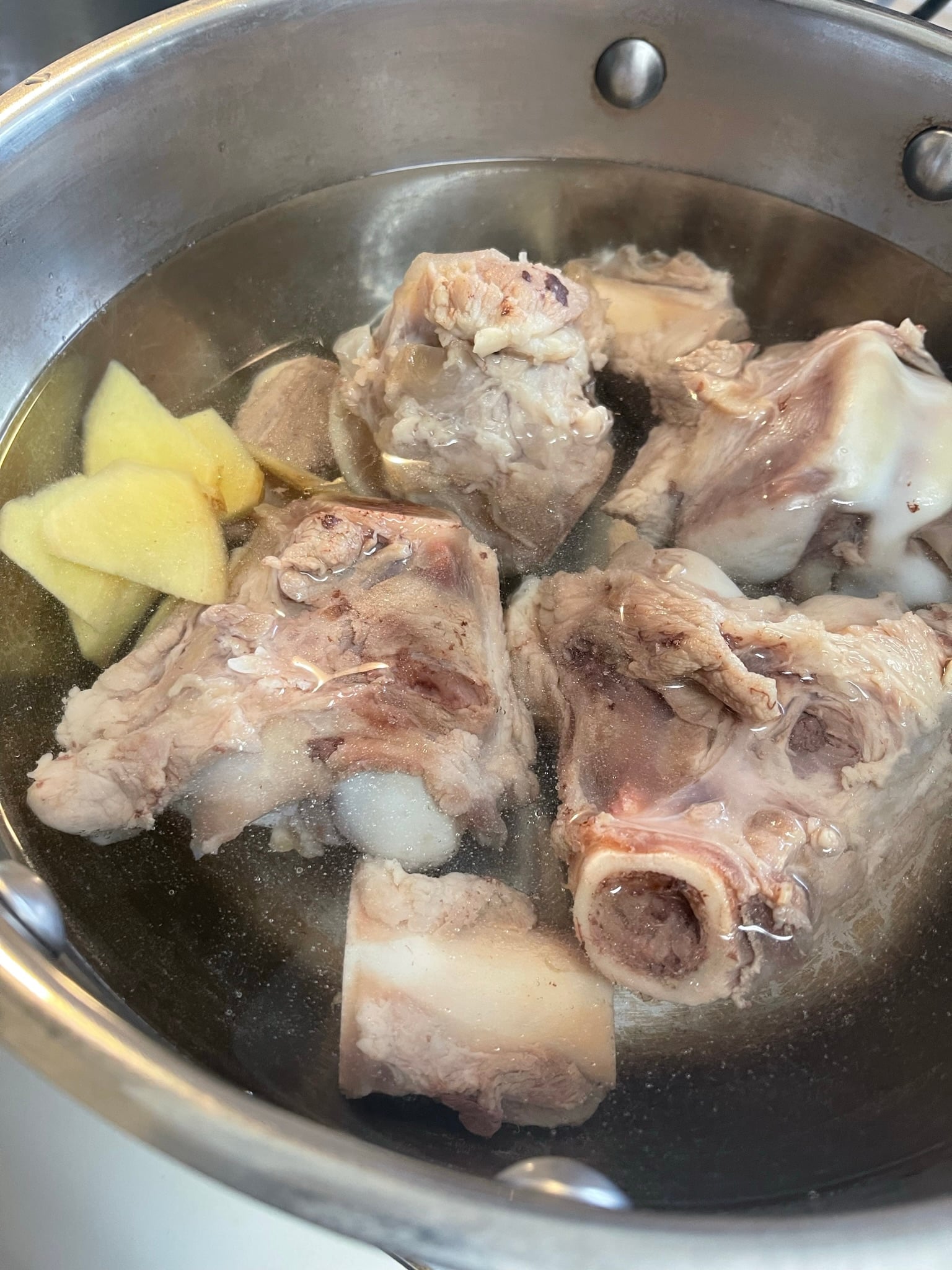 Return the cleaned bones to the pot and add fresh water and ginger slices. Bring to a boil, then reduce to a gentle simmer. Simmer uncovered for 1½-2 hours, skimming any foam that rises to the surface.