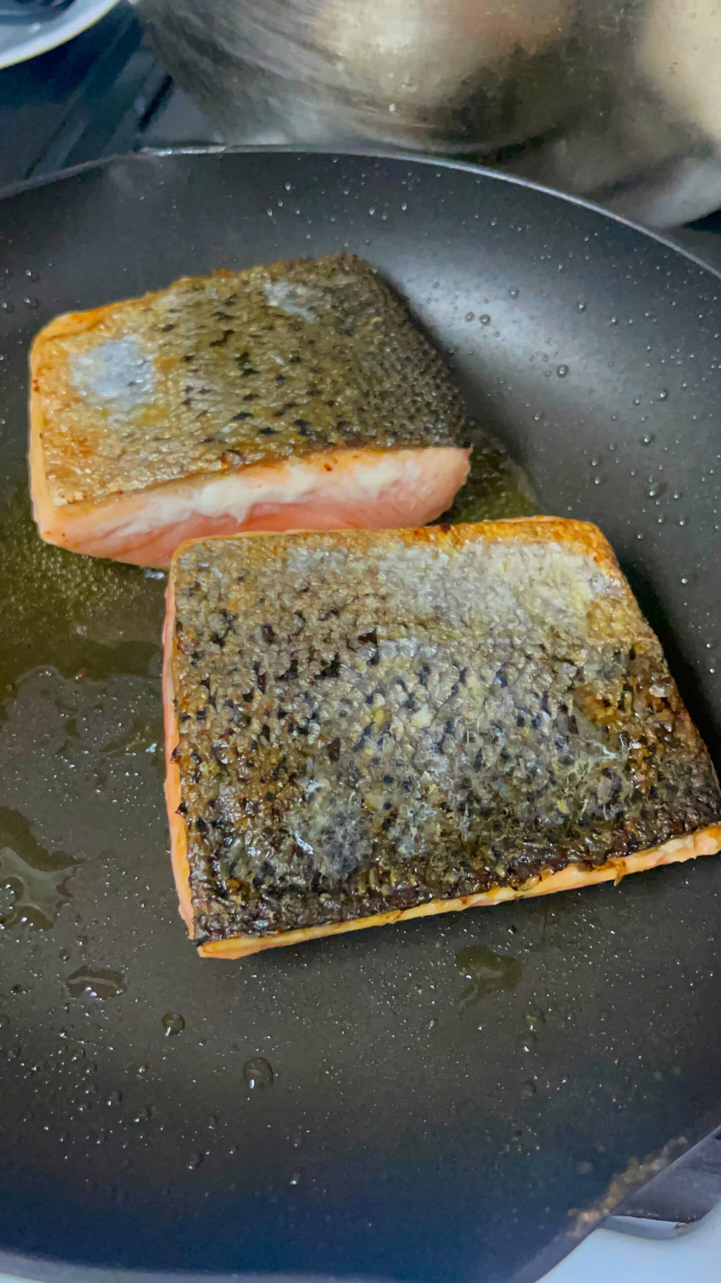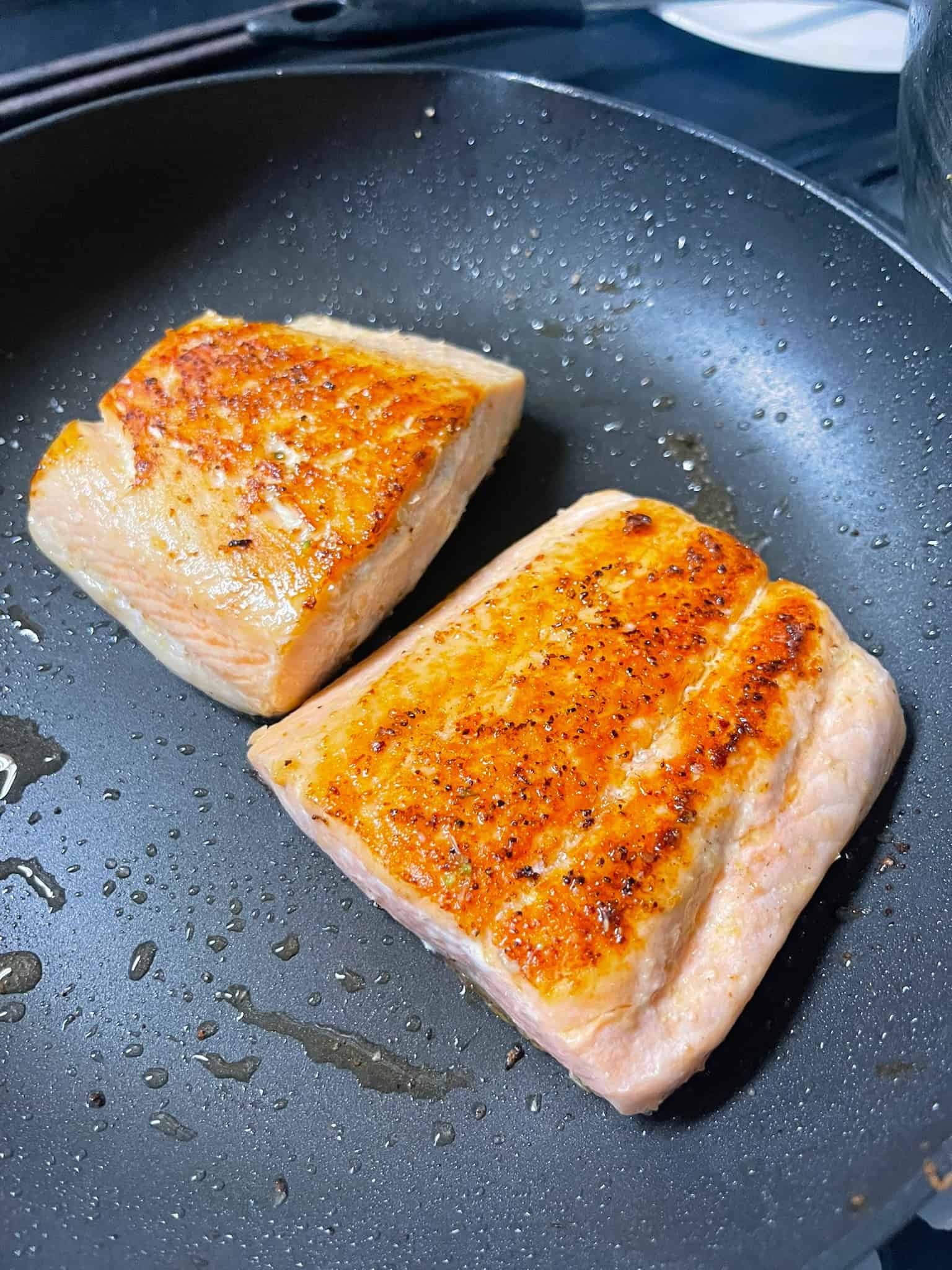 - Sear the salmon: If using skin-on salmon, place it skin-side down in the pan. If using skinless salmon, place the presentation side down first. Cook undisturbed for 4–6 minutes, until the salmon releases easily from the pan and the color has risen about halfway up the sides.