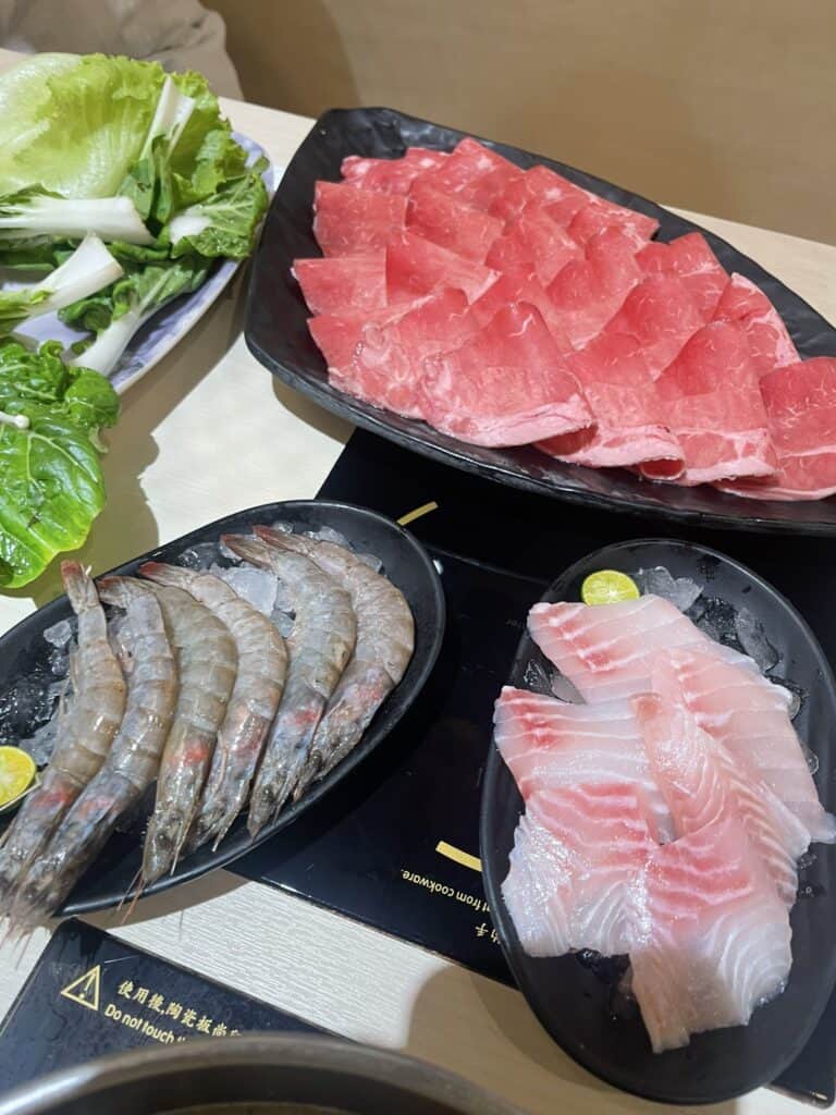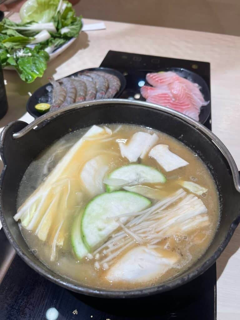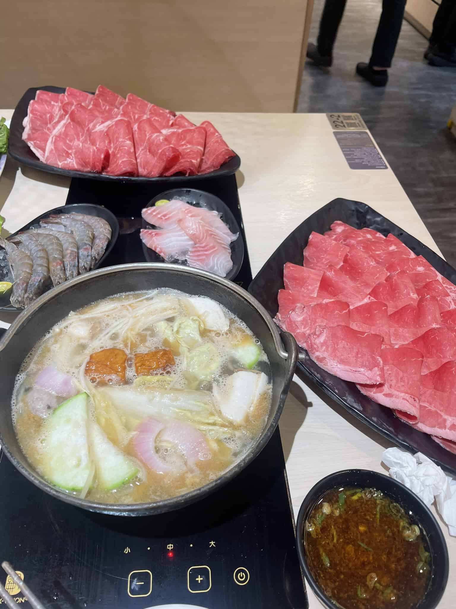 They had an all-you-can-eat section with tons of veggies (napa cabbage, leafy greens, mushrooms, onions, tofu, and more), plus noodles, sauces, drinks, and even ice cream at the end. You basically just keep grabbing ingredients and cooking at your own pace.