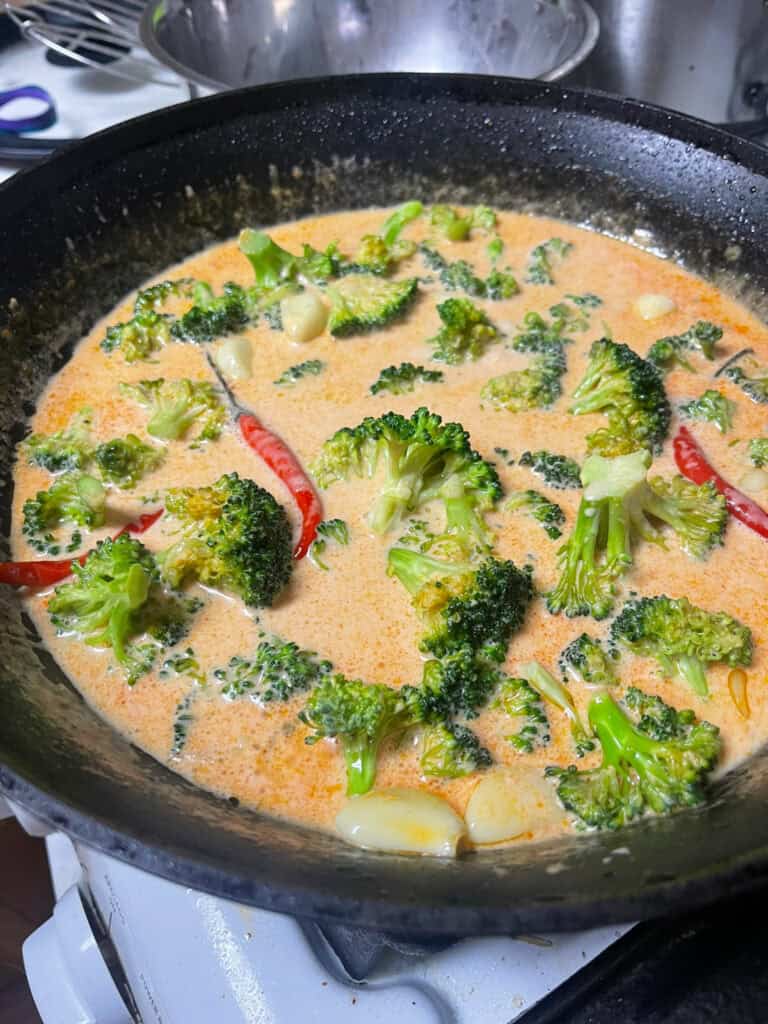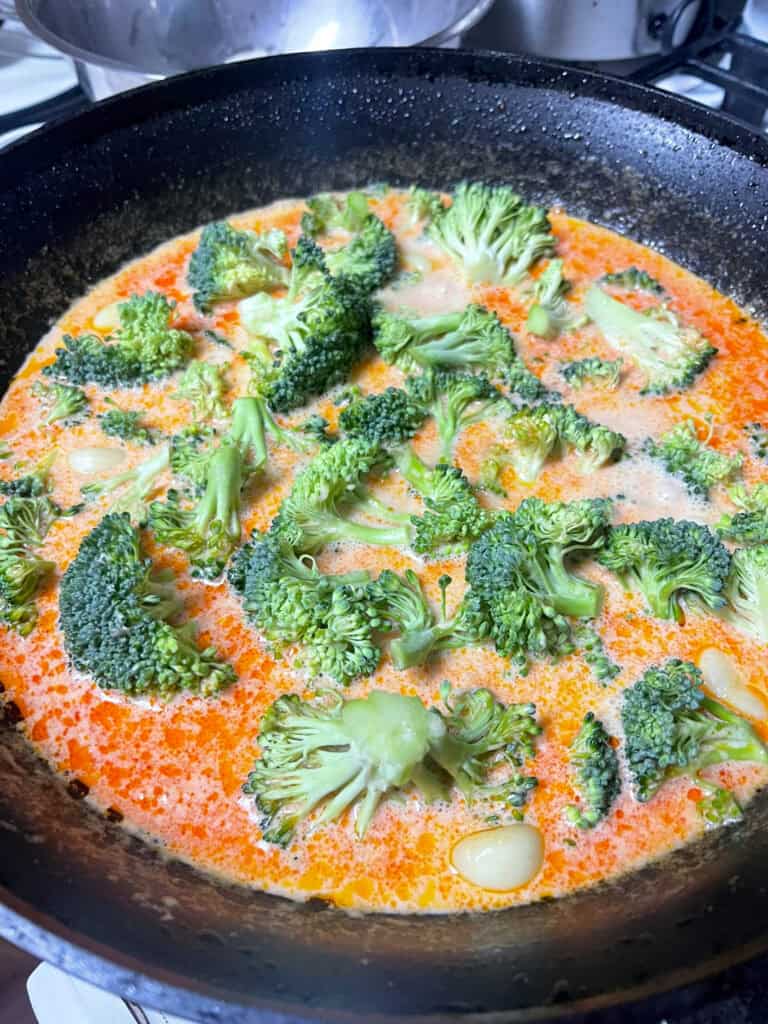 Add broccoli to the sauce and simmer for 4-6 minutes until crisp-tender. You want it bright green and slightly firm, not soft.