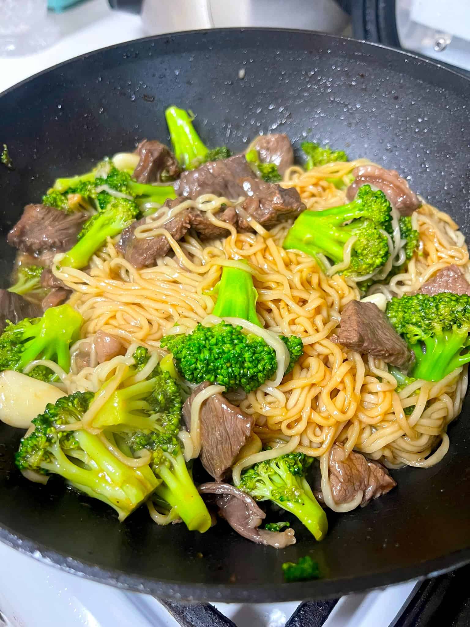 Return the noodles and beef to the pan. Pour in the sauce and toss everything together until evenly coated and heated through.