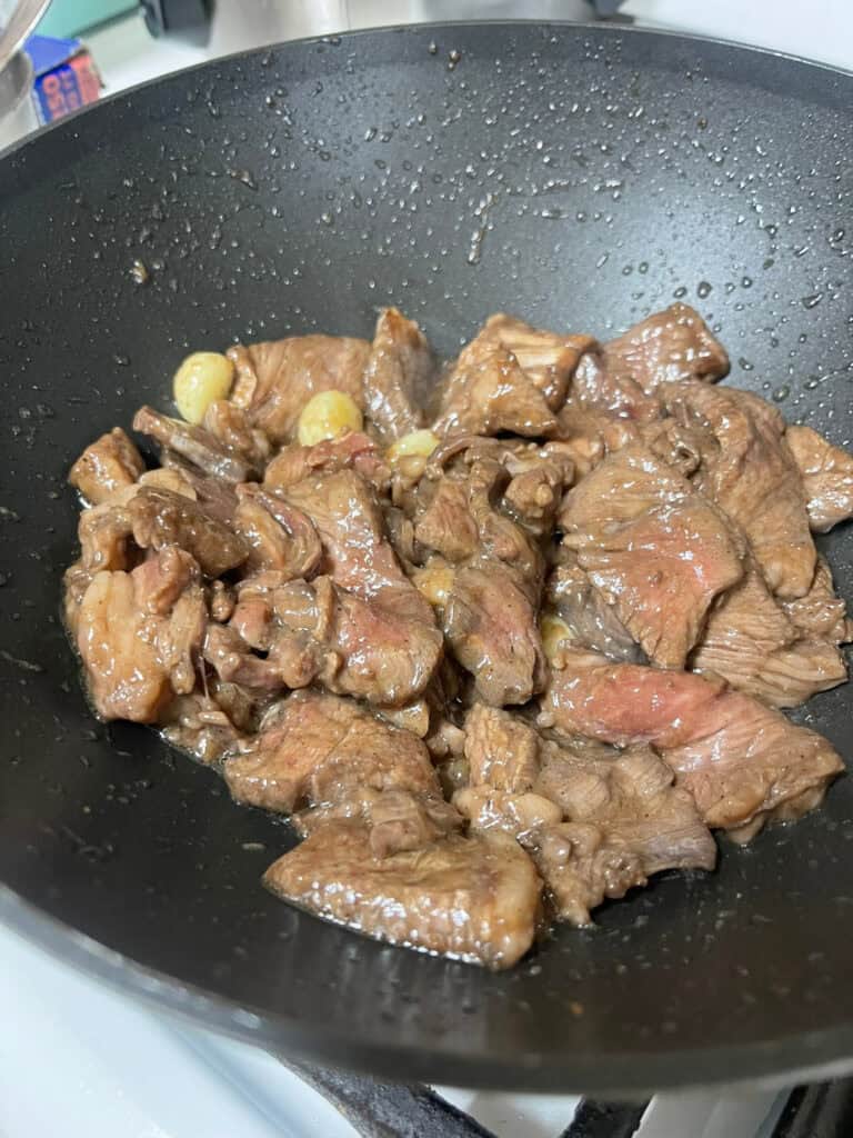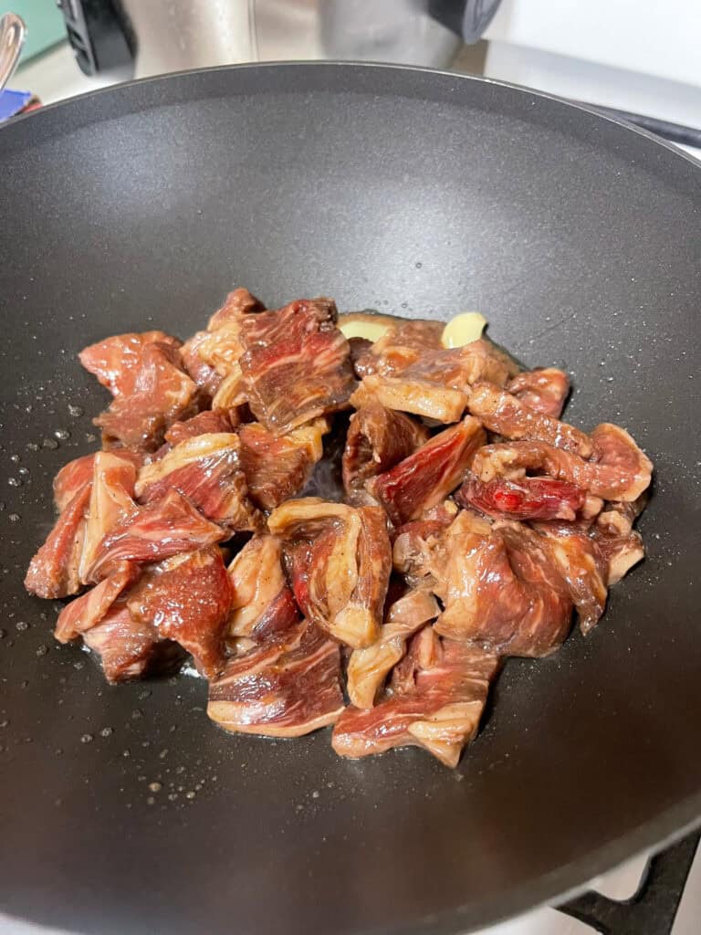 Heat oil in a pan or wok, add the beef and garlic, and stir fry until the beef is just cooked through. Remove and set aside.