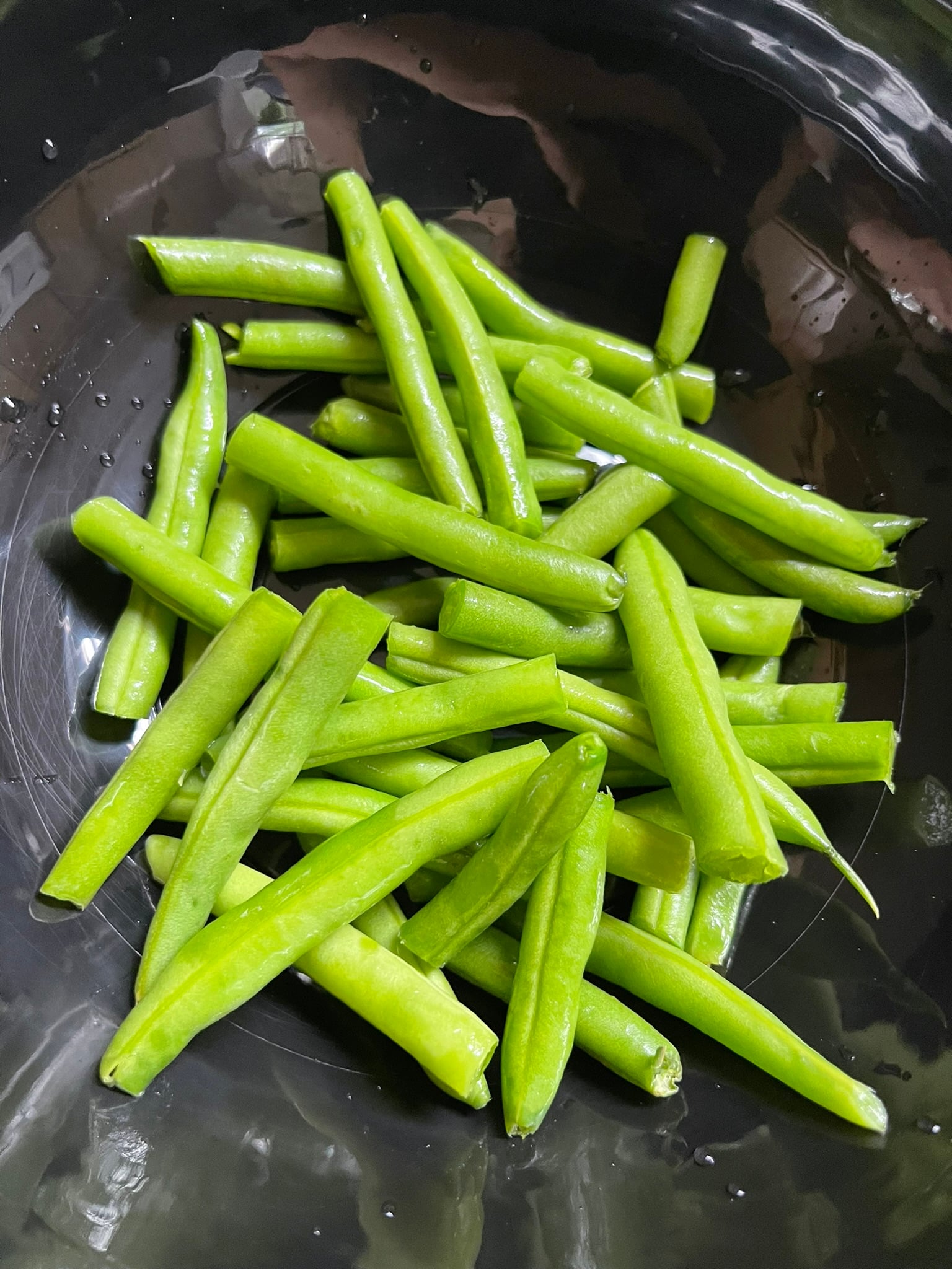 Trim and cut the green beans into bite-sized pieces. Rinse and set aside.