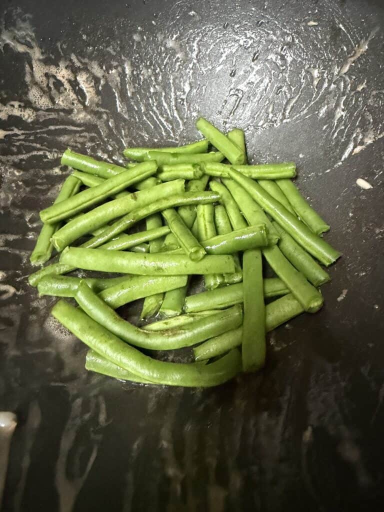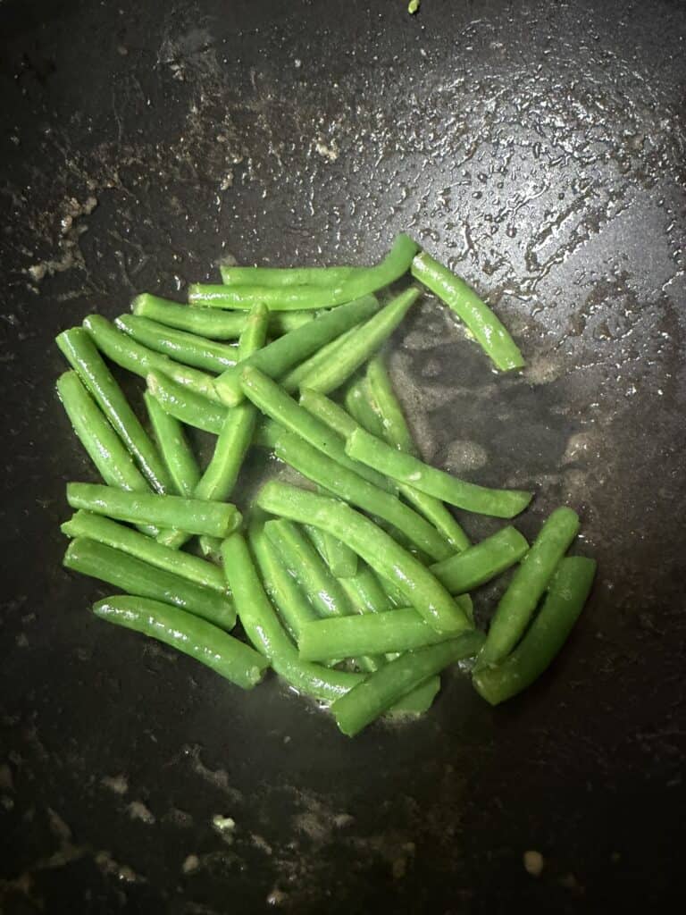 In the same pan, add a bit more oil if needed. Add green beans and stir fry.