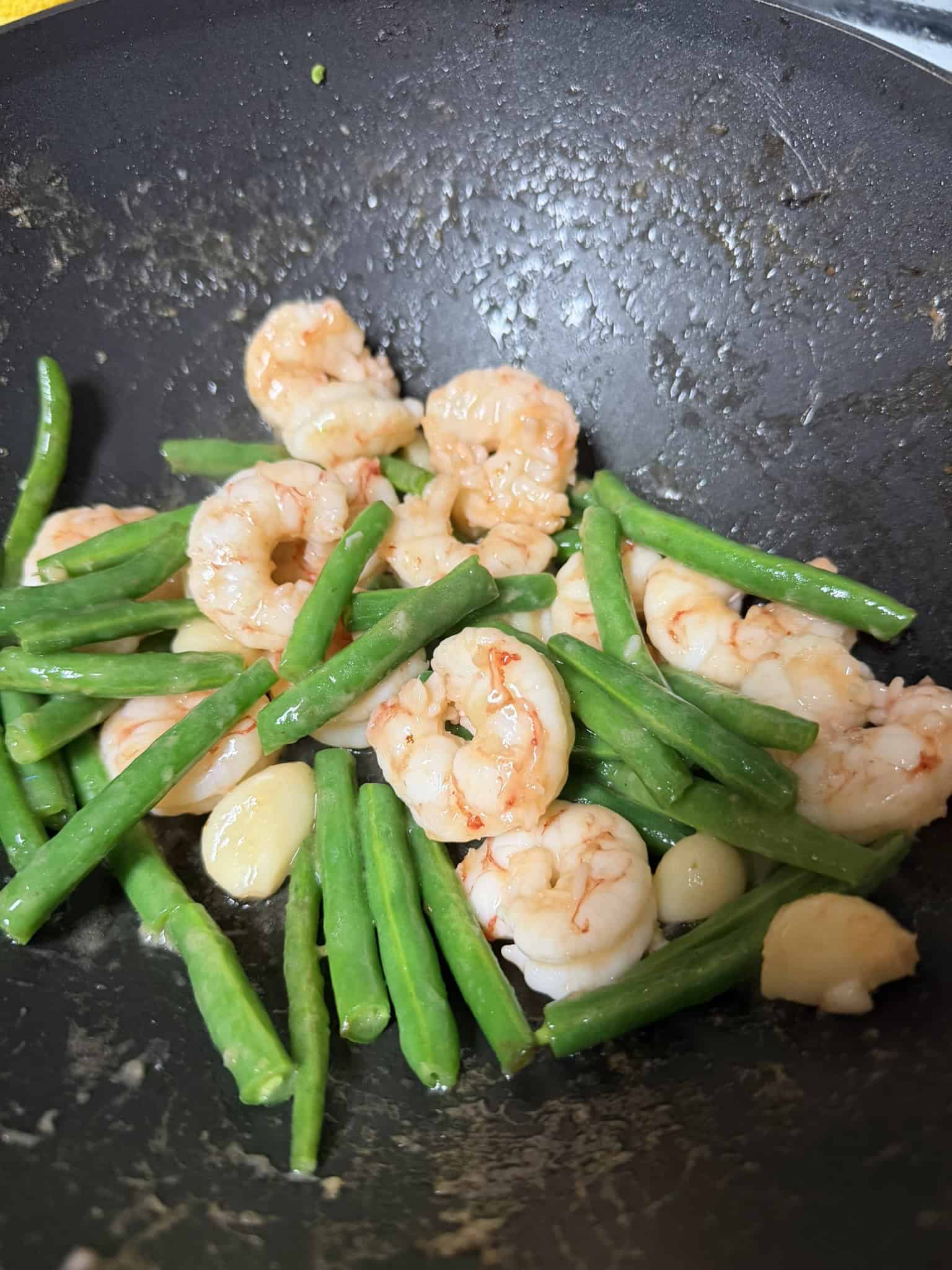 Add shrimp and stir fry until just cooked through. Remove from pan and set aside. - Cook the green beans